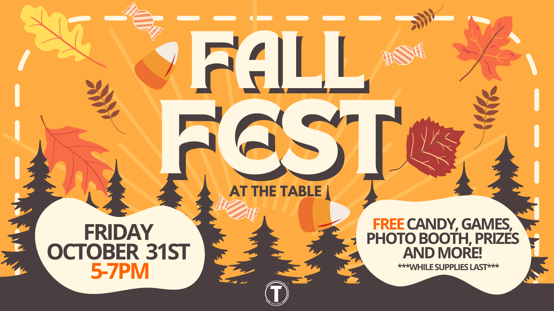 Join us at The Table for our annual Fall Fest! 🍁 Families are invited to enjoy a fun, free evening packed with free candy, exciting games, a fall photo booth, and giveaways.