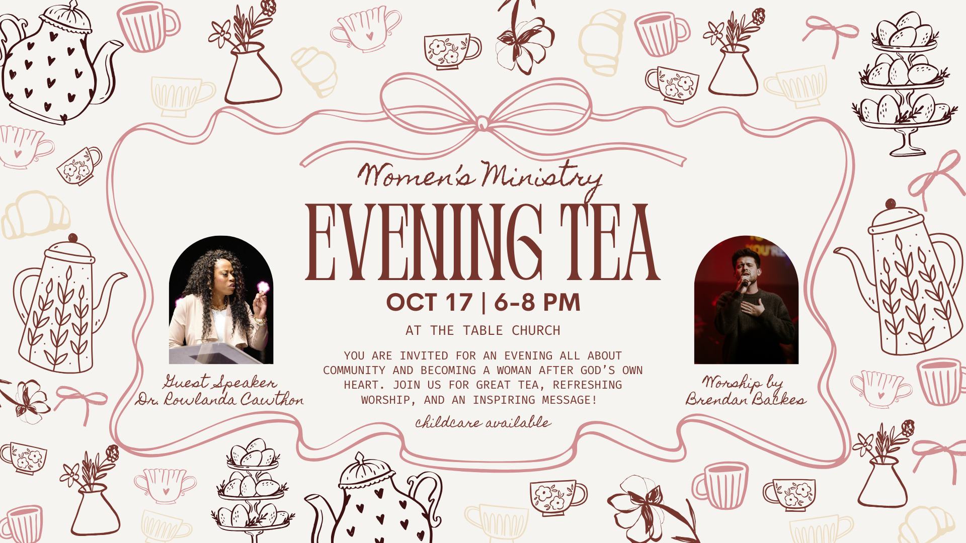 You are invited for an evening all about community and becoming a woman after God’s own heart. Join us for great tea, refreshing worship by Brendan Backes, and an inspiring message given by Dr. Rowlanda Cawthon! Childcare is available at the event.