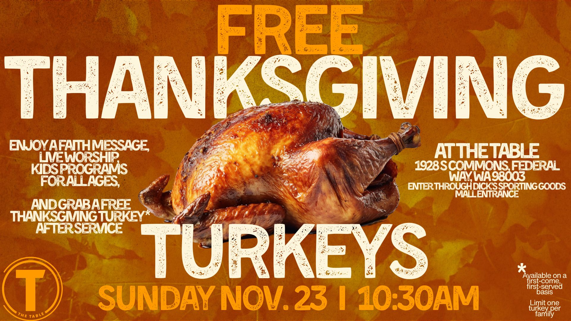 🦃 FREE THANKSGIVING TURKEYS SUNDAY, NOVEMBER 23! Join us at 10:30am for worship, a hope-filled message, kids programs, and a free turkey...